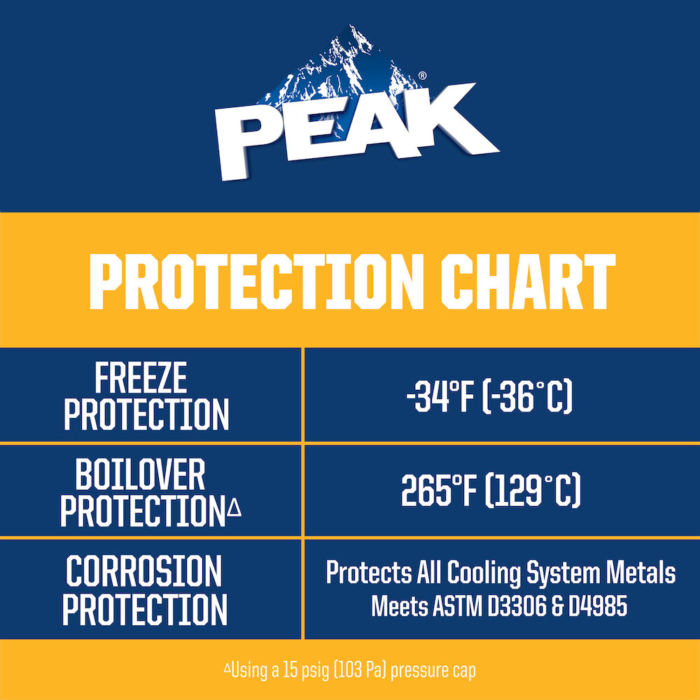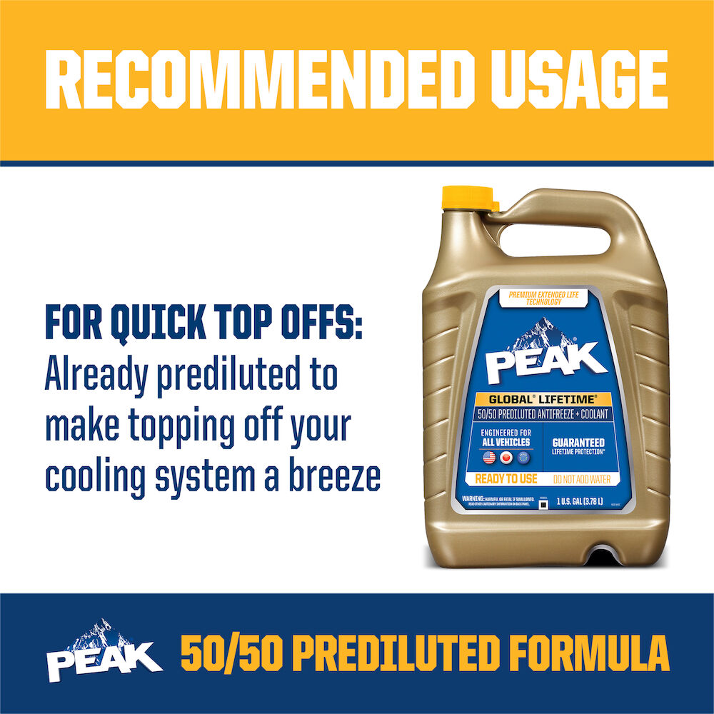 PEAK Global® LifeTime® 50/50 Antifreeze + Coolant features an advanced organic acid technology that provides guaranteed lifetime protection for as long as you own your vehicle!* Its specially-engineered formula will provide maximum protection against damaging rust and corrosion in all automobiles and light/medium duty trucks worldwide, regardless of make, model, year or original antifreeze color.