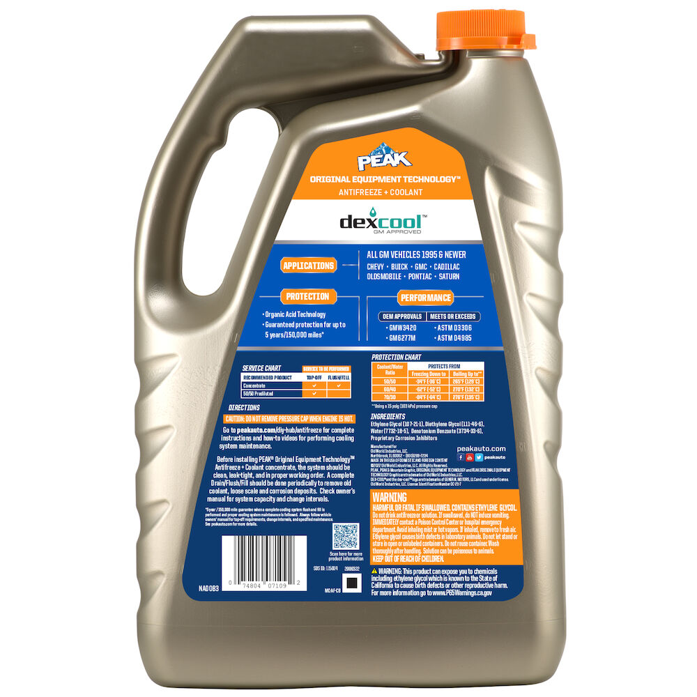 PEAK® ORIGINAL EQUIPMENT TECHNOLOGY™ DEX-COOL® ANTIFREEZE + COOLANT is a premium GM-approved extended life coolant engineered to match technology and color requirements for all vehicles model years 1995 and newer. This coolant is formulated with the same corrosion inhibitor technology that protected your vehicle straight from the factory. Color cues on the packaging and a list of covered vehicles on the front label make it easy to confirm that this is the right match for your specific GM vehicle.