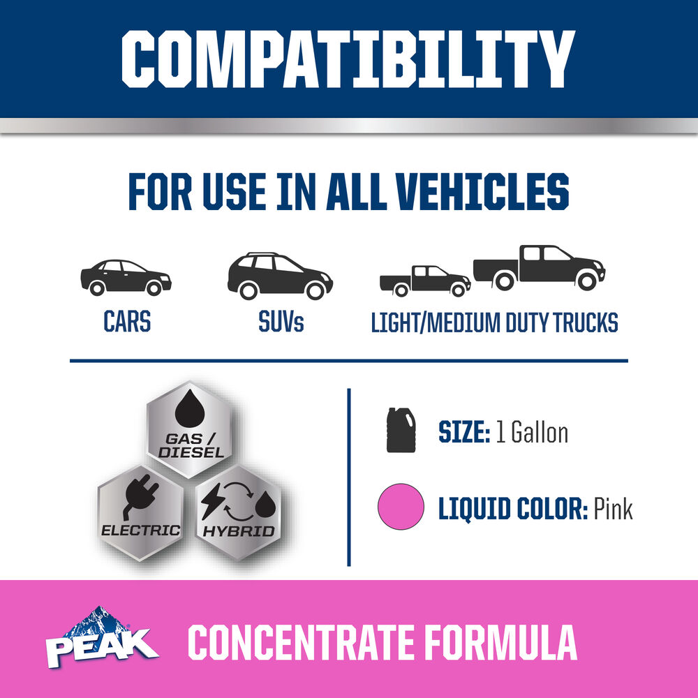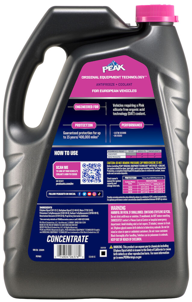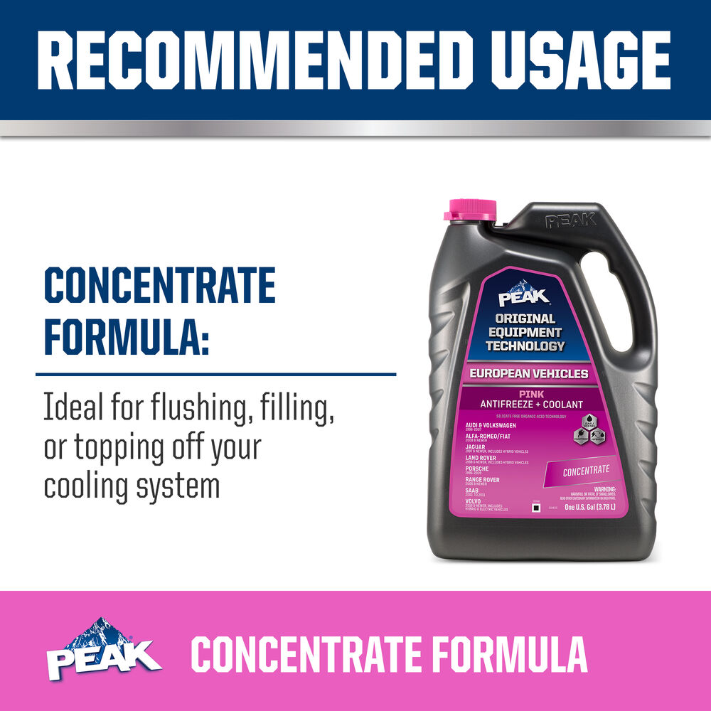 PEAK ORIGINAL EQUIPMENT TECHNOLOGY CONCENTRATE ANTIFREEZE + COOLANT for EUROPEAN VEHICLES - PINK is an ethylene glycol-based antifreeze/coolant specifically developed for use in any European vehicle requiring a Pink silicate-free organic acid technology (OAT) formulation. It contains high-quality organic acid corrosion inhibitors and is free of borate, nitrite, nitrate, phosphate, silicate and amines chemicals.