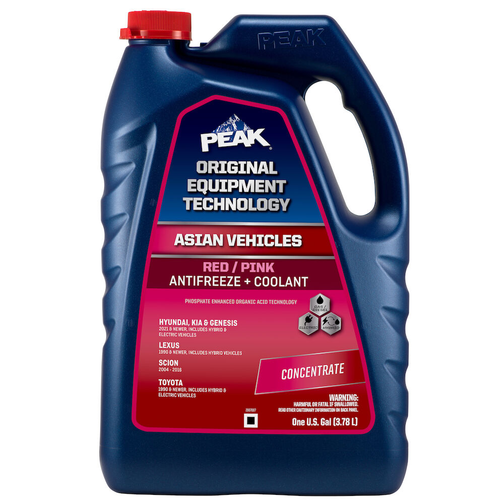 PEAK® ORIGINAL EQUIPMENT TECHNOLOGY™ ANTIFREEZE + COOLANT for ASIAN VEHICLES - RED/PINK is an ethylene glycol-based antifreeze/coolant specifically developed for use in any Asian vehicle requiring a red or pink phosphate-enhanced organic acid technology (POAT) formulation. It contains high-quality organic acid corrosion inhibitors and is free of borate, nitrite, silicate and amines.