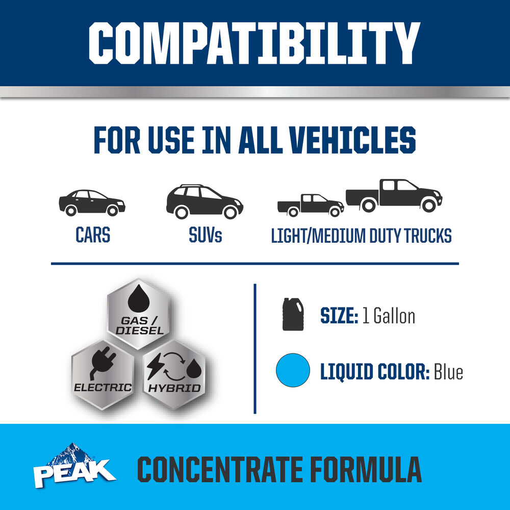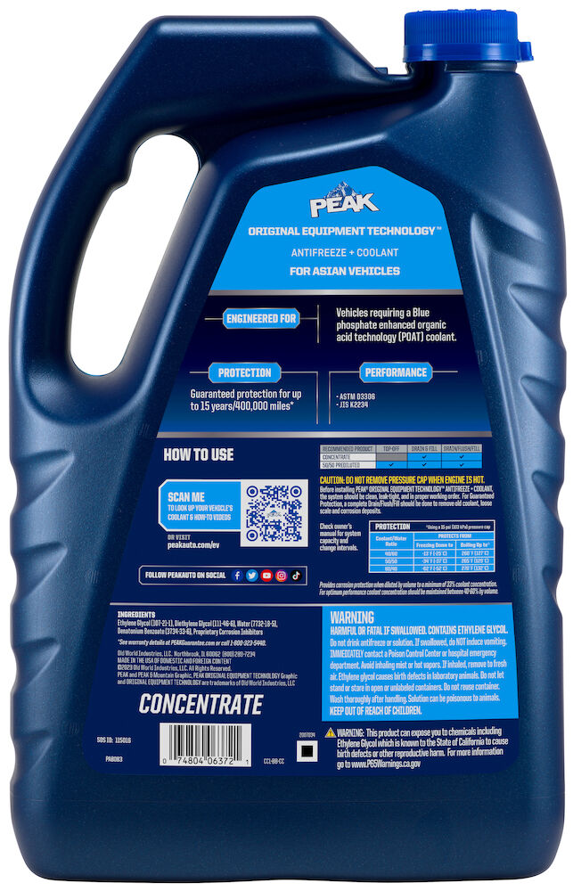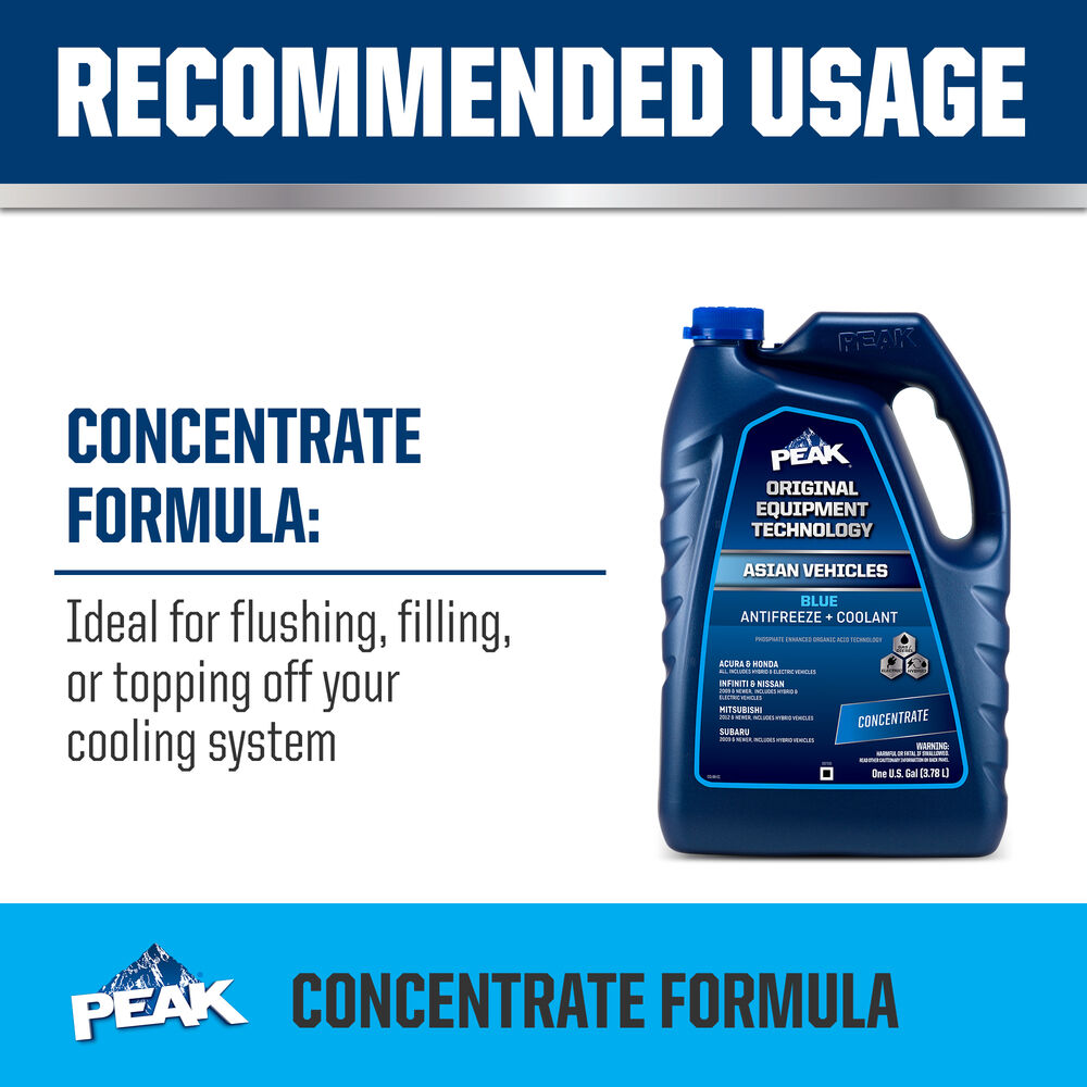 PEAK ORIGINAL EQUIPMENT TECHNOLOGY™ Concentrate Antifreeze + Coolant For Asian Vehicles - BLUE is an ethylene glycol-based antifreeze/coolant specifically developed for use in any Asian vehicle requiring a Blue phosphate-enhanced organic acid technology (POAT) formulation. It contains high-quality organic acid corrosion inhibitors and is free of borate, nitrite, silicate and amines chemicals.