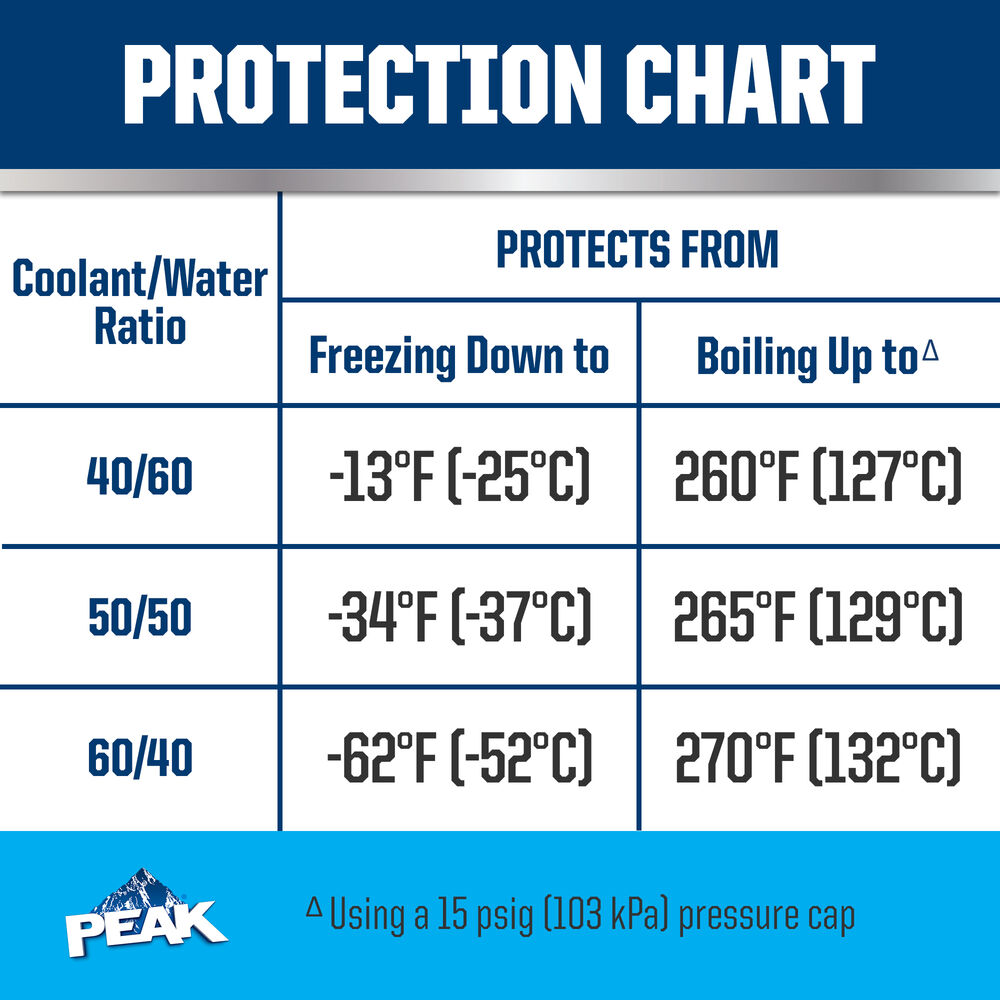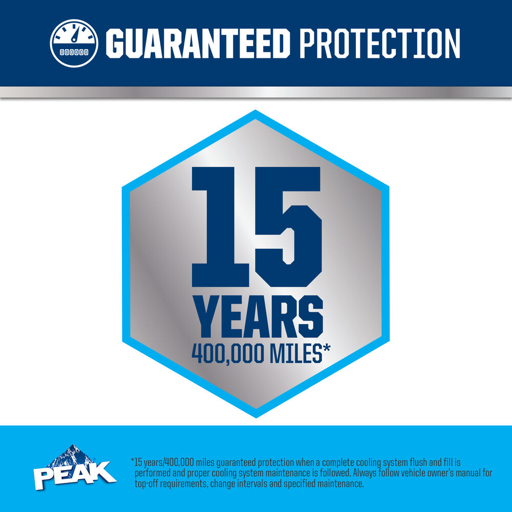 PEAK ORIGINAL EQUIPMENT TECHNOLOGY™ ANTIFREEZE + COOLANT for ASIAN VEHICLES - BLUE meets the performance requirements of ASTM D3306 and JIS K2234. With a complete flush and fill, PEAK guarantees this coolant will provide service life protection of up to 150,000 miles or 5 years. Use PEAK ORIGINAL EQUIPMENT TECHNOLOGY™ Concentrate Antifreeze + Coolant For Asian Vehicles - BLUE to perform a complete flush/fill or top-off.