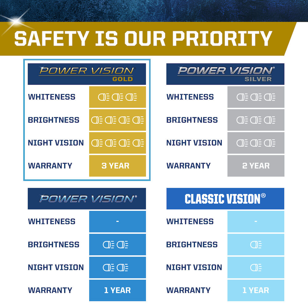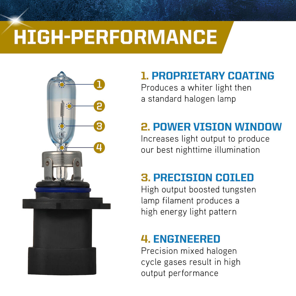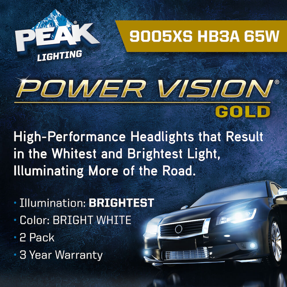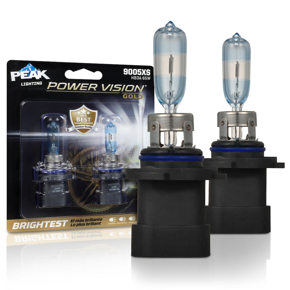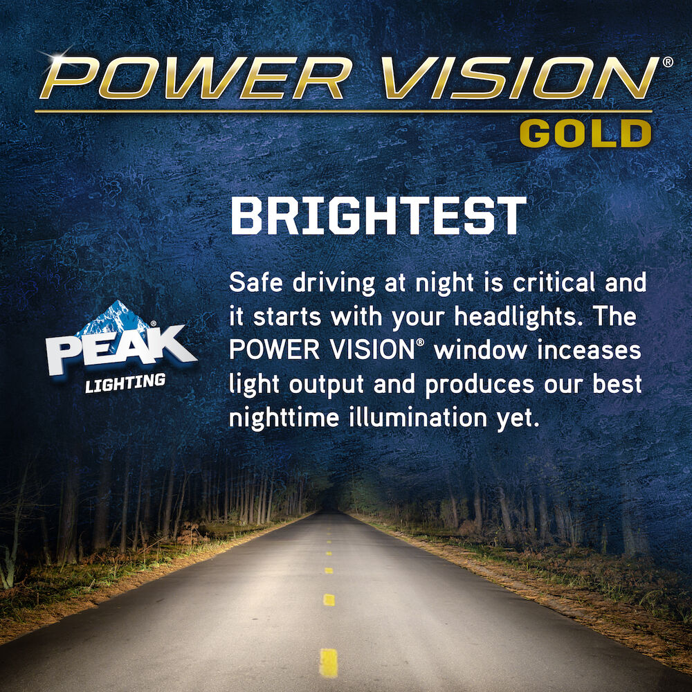 The PEAK Power Vision Gold Headlamps feature high-performance tungsten filaments and customized gas mixtures, combined with a proprietary optical coating. Safe driving at night is critical, and it starts with your headlights. The sooner you’re able to see an object on the road the quicker you can react. Make sure your headlights are performing correctly and be sure to replace them with a high-performance headlights for increased visibility.