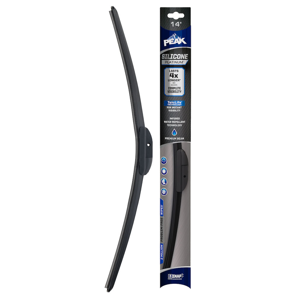 PEAK® SILICONE PLATINUM™ is our premium top-of-the-line beam wiper blade, engineered to last 4X longer and delivers complete visibility throughout every season. The Quad-layered wiping element technology is constructed with a silicone compound for longevity, providing 2 million problem-free wipers* during the life of the blade. The infused water repellent technology coats the windshield, shedding rain and winter road spray. Use of TalcLife™ Technology, a proprietary talcum coating, ensures the smoothest possible wipe. Upgrade to a high-end wiper blade that endures through all season with PEAK® SILICONE PLATINUM™ wiper blades. These blades are equipped with EZ-SNAP® Universal Connector System to fit most wiper arm styles. Installation is quick and easy with simple to follow instructions inside the package. Blades area available in lengths of 13" to 28".