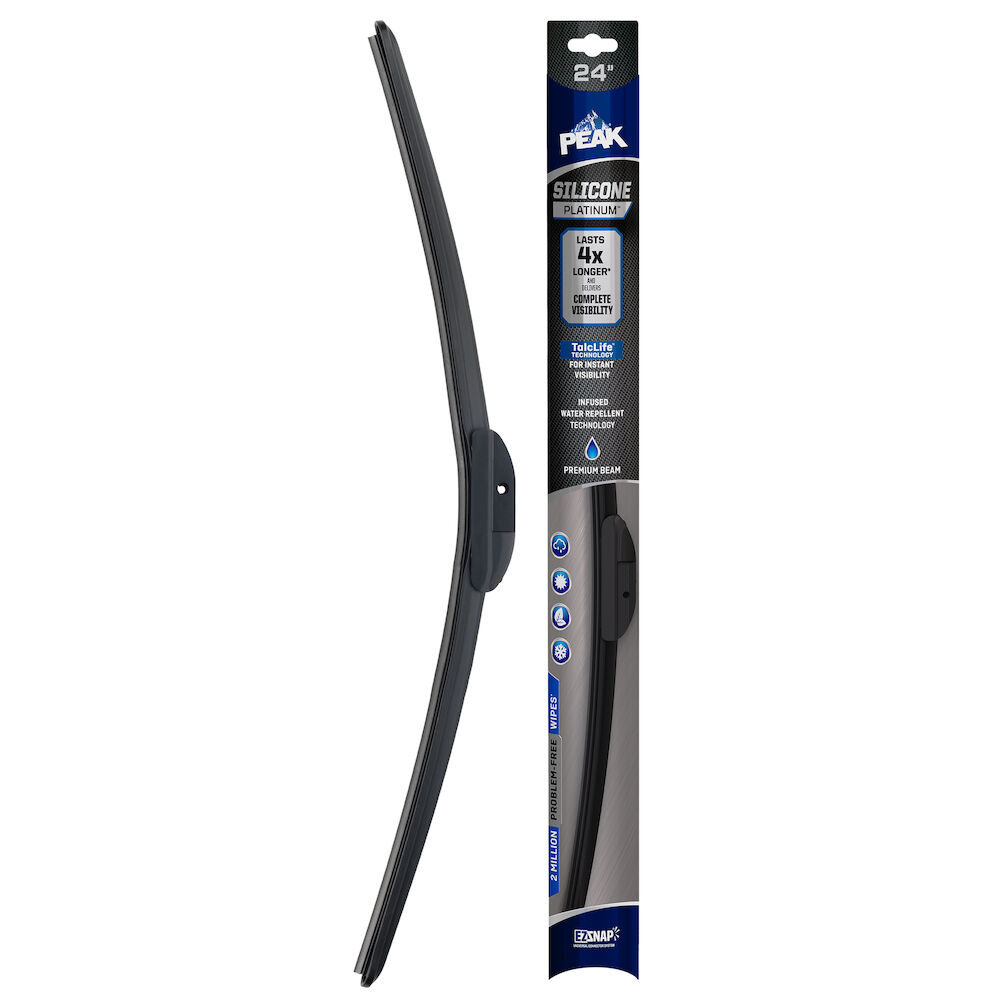 PEAK® SILICONE PLATINUM™ is our premium top-of-the-line beam wiper blade, engineered to last 4X longer and delivers complete visibility throughout every season. The Quad-layered wiping element technology is constructed with a silicone compound for longevity, providing 2 million problem-free wipers* during the life of the blade. The infused water repellent technology coats the windshield, shedding rain and winter road spray. Use of TalcLife™ Technology, a proprietary talcum coating, ensures the smoothest possible wipe. Upgrade to a high-end wiper blade that endures through all season with PEAK® SILICONE PLATINUM™ wiper blades. These blades are equipped with EZ-SNAP® Universal Connector System to fit most wiper arm styles. Installation is quick and easy with simple to follow instructions inside the package. Blades area available in lengths of 13" to 28".