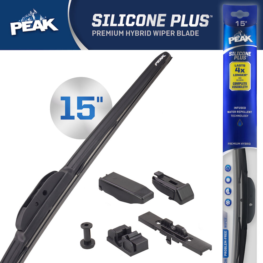 PEAK® SILICONE PLUS™ premium hybrid wiper blades are engineered to last 4X longer* and deliver complete visibility in any weather driving condition. The Tri-layer wiping element is constructed with a silicone compound for longevity providing 2 million problem-free wipes* during the life of the blade. The infused water repellent technology coats the windshield shedding rain and winter road spray. Upgrade to a premium solution to get consistent performance in all seasons with the PEAK® SILICONE PLUS™ wiper blades. These blades are equipped with EZ-SNAP® Universal Connector System to fit most wiper arm styles. Installation is quick and easy with simple to follow instructions inside the package. Blades are available in lengths of 13” to 28”.