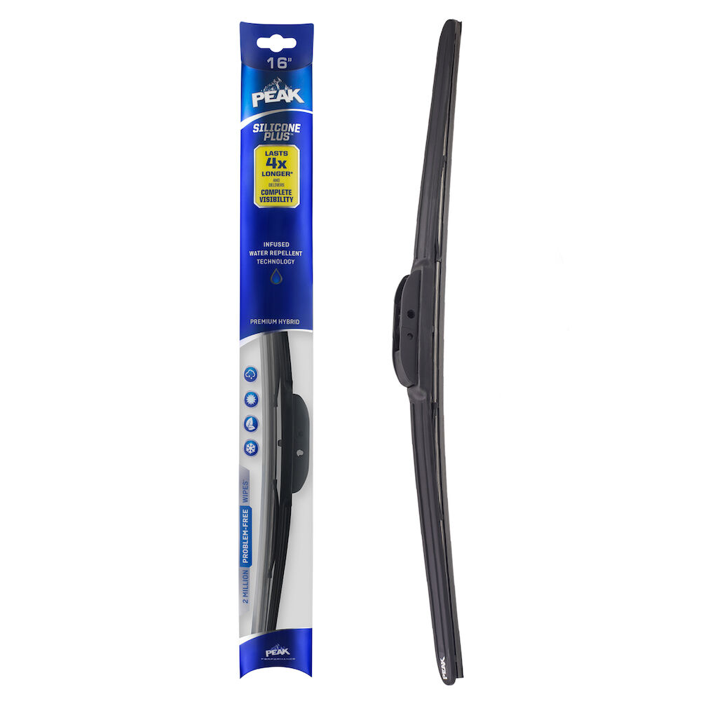 PEAK® SILICONE PLUS™ premium hybrid wiper blades are engineered to last 4X longer* and deliver complete visibility in any weather driving condition. The Tri-layer wiping element is constructed with a silicone compound for longevity providing 2 million problem-free wipes* during the life of the blade. The infused water repellent technology coats the windshield shedding rain and winter road spray. Upgrade to a premium solution to get consistent performance in all seasons with the PEAK® SILICONE PLUS™ wiper blades. These blades are equipped with EZ-SNAP® Universal Connector System to fit most wiper arm styles. Installation is quick and easy with simple to follow instructions inside the package. Blades are available in lengths of 13” to 28”.